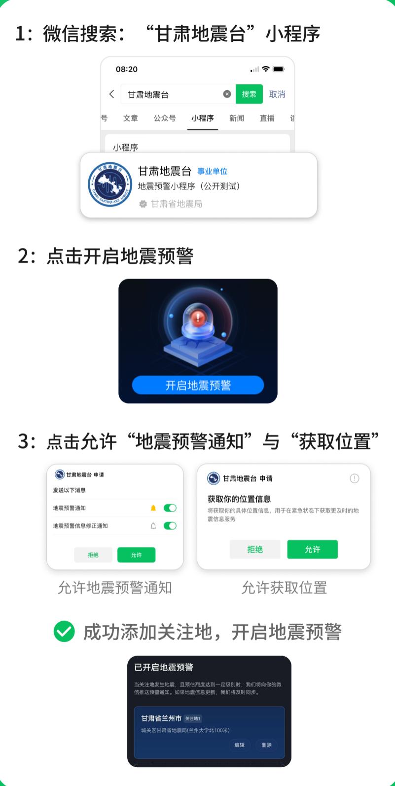 为便利社会公众和企事业单位接受地震预警信息服务,现发布甘肃省现有地震预警信息服务指引如下: