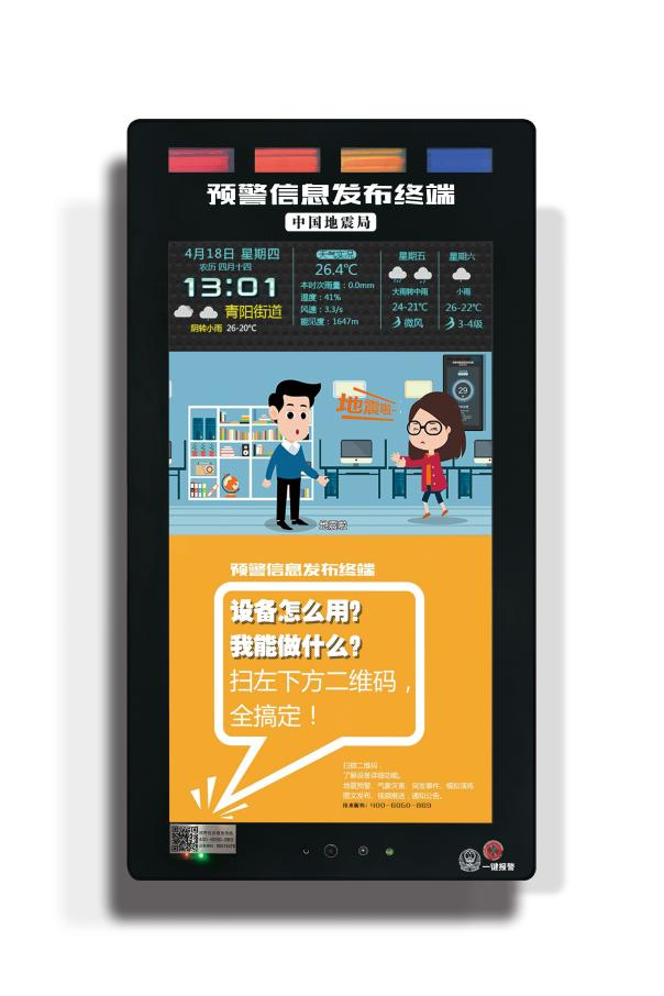(2)地震预警专用终端。通过布设在学校、医院、社区等人员密集场所的地震预警专用终端发布地震预警信息,通过声光报警,显示地震预警震级、预警时间等方式呈现。