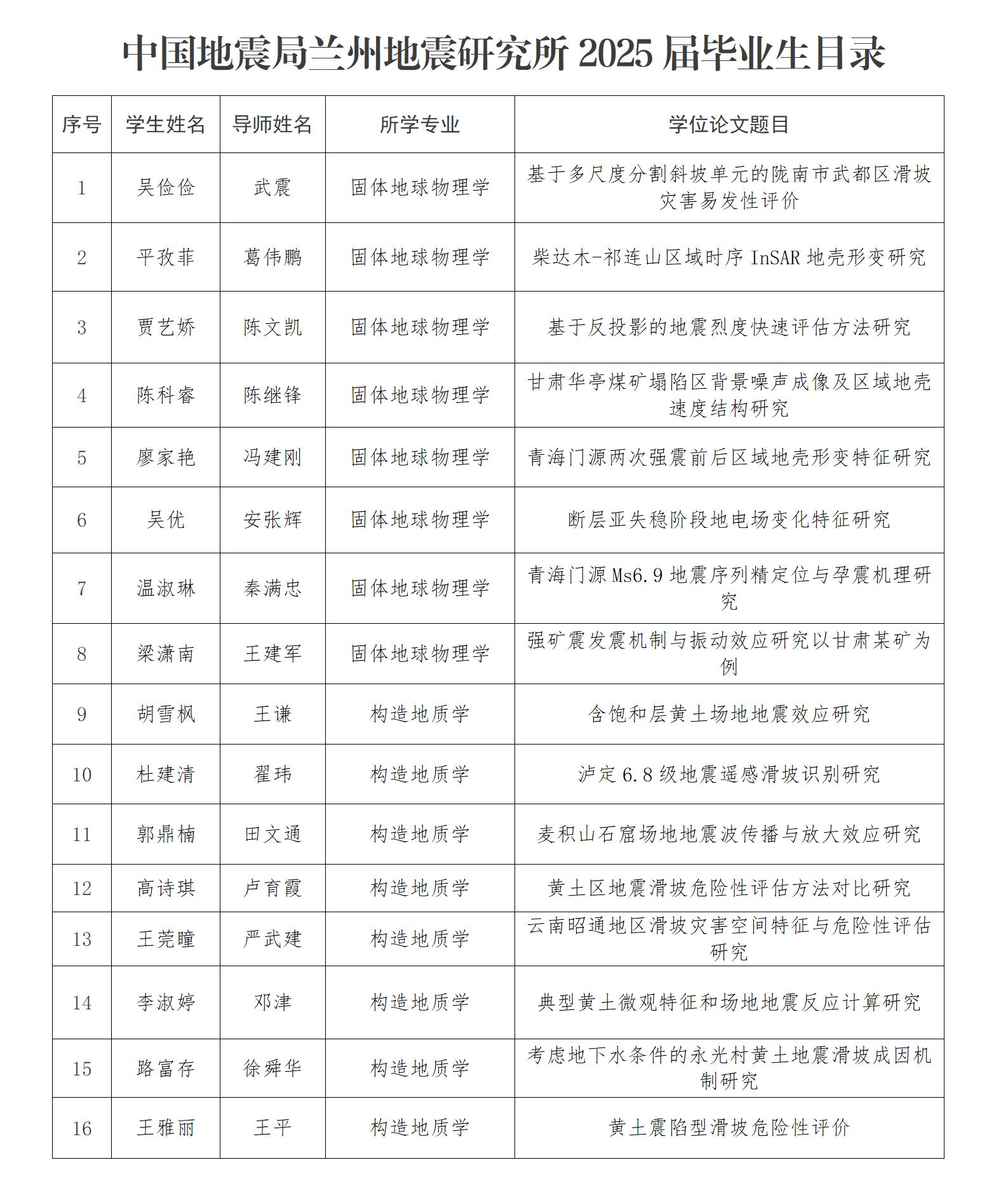 中国地震局兰州地震研究所2025年硕士研究生招生拟录取名单公示