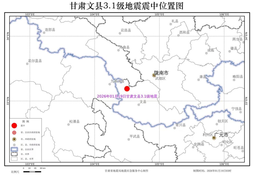 中国地震台网正式测定:01月19日03时20分在甘肃陇南市文县(北纬33.19度,东经104.50度)发生3.1级地震,震源深度9千米。