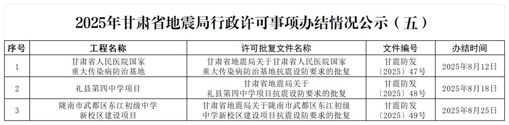 2025年甘肃省地震局行政许可事项办结情况公示(五)